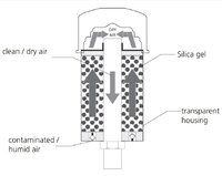 Desiccant breathers prevent solid particles as well as humidity, snow, spray- or rainwater from entering. They may even be used in sea atmosphere without any problems. The fi lter consists of a vessel with silica gel and an integrated ventilating fi lter.