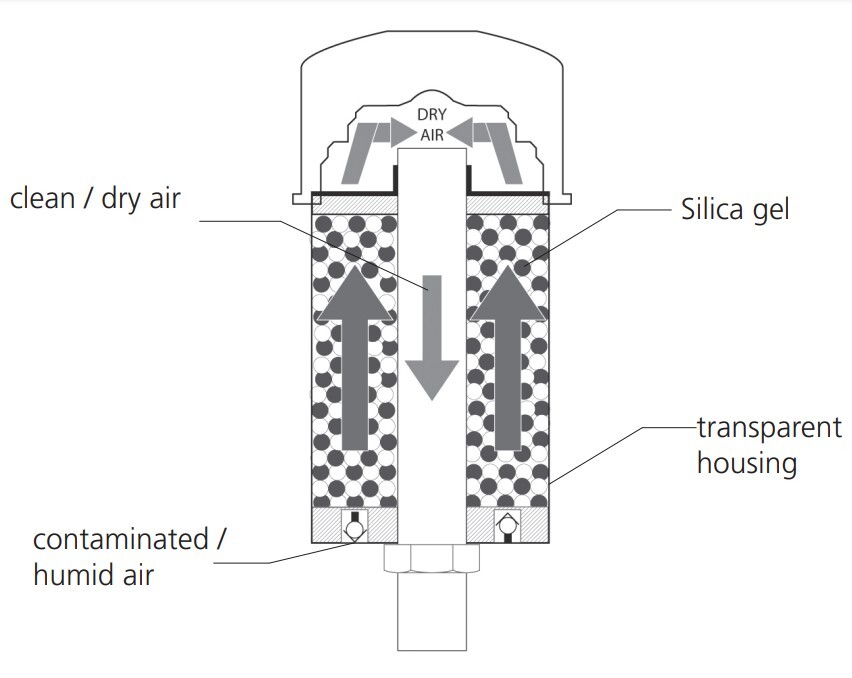 The air fl ows via the in the bottom integrated valves into the desiccant breather, therein the humid air is fi rst dried in Silica gel, then the solid particle contamination is removed by the 3 µm fi ne ventilating fi lter.