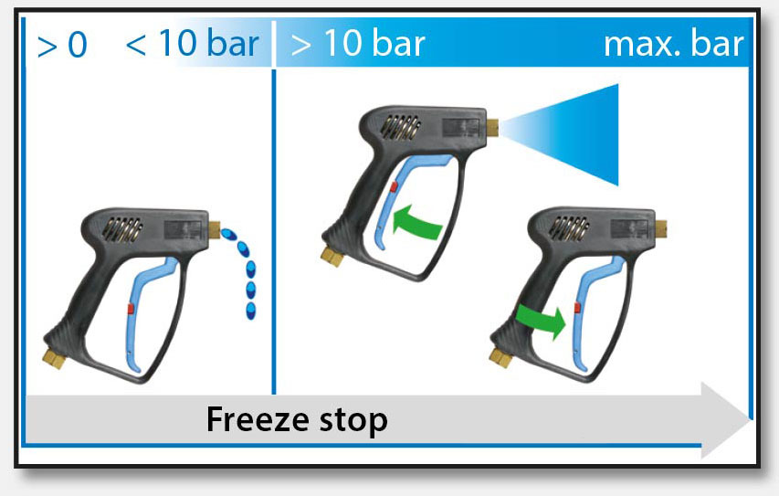 Autojen pesuun ja teollisuuskäyttöön kiinteällä 3/8" sisäkierteellä oivallisesti soveltuva RST-osin valmistettu painepesurikahva. Pesukahvaan voidaan liittää tarkoitukseen sopiva pesurivarsi. Pesukahva varustettu puristusvoimaa vähentävällä LTF-mekanismilla. Lisäksi pistoolin venttiilirakenne on ns Freeze-stop. Kun kahva paine on alle 10bar niin se tiputtaa hiukan läpi estäen kahvan jäätymisen ja halkeamisen.