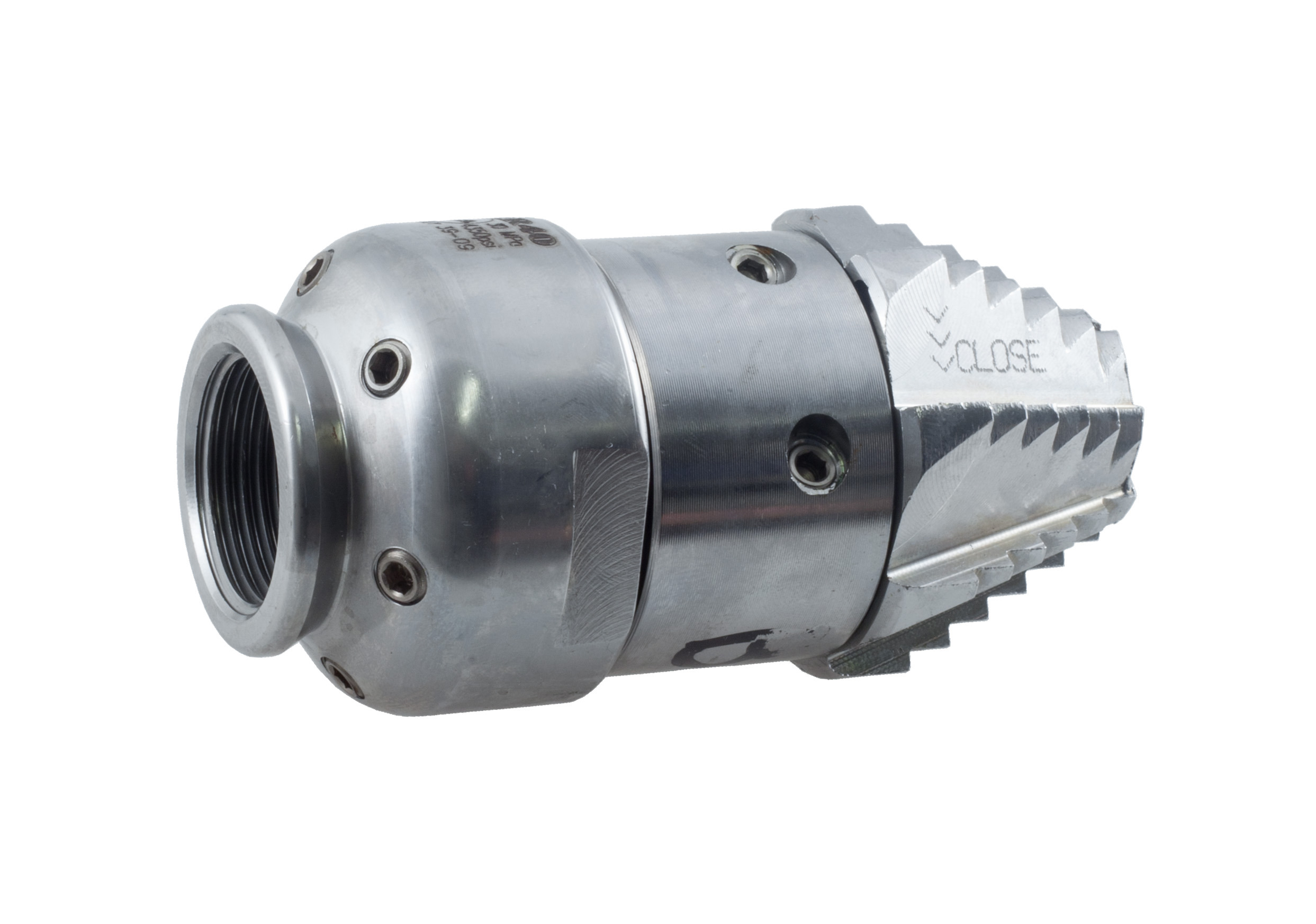 Suuttimen etuosassa pyörivät, leikkaavat terät. Suutin valmistettu haponkestävästä teräksestä.